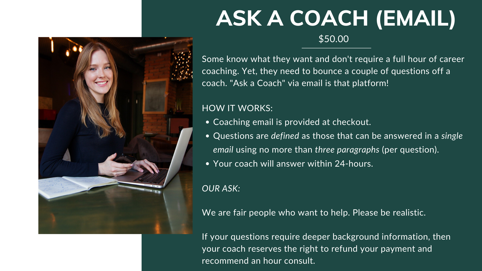 If you have burning questions that don’t require a full coaching session, then send us an email, and our coaches will respond within 24 hours!